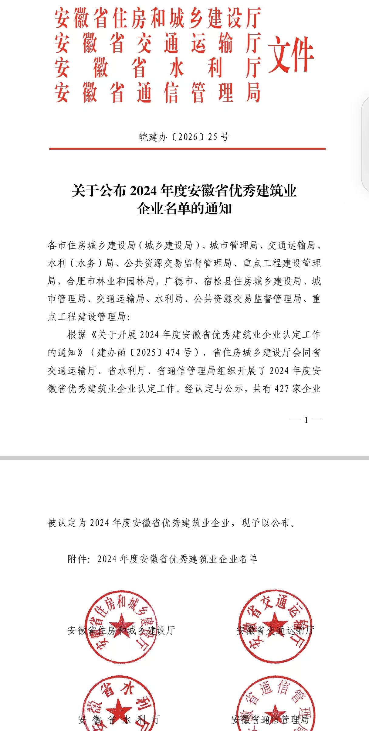 喜報(bào):淮南建發(fā)檢測公司榮獲2024年度安徽省優(yōu)秀建筑業(yè)企業(yè)(工程質(zhì)量檢測類)榮譽(yù)稱號!